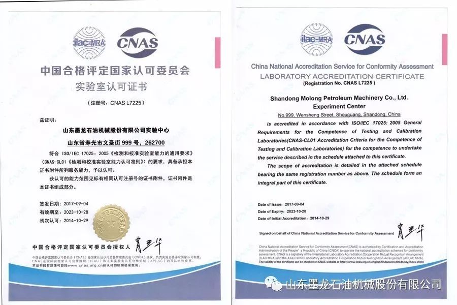 山東墨龍石油機(jī)械股份有限公司實(shí)驗(yàn)中心近期順利通過CNAS(國家實(shí)驗(yàn)室認(rèn)可)擴(kuò)項(xiàng)、換證現(xiàn)場評審,並於2017年9月4日取得新的證書。